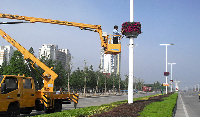 輕型伸縮臂高空車更換照明路燈施工現場…
